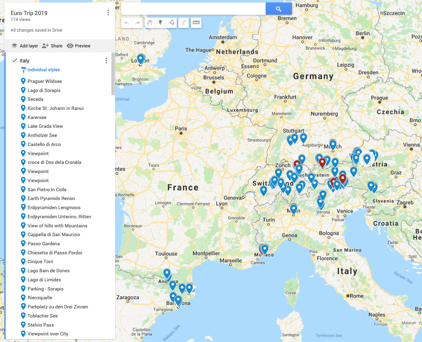 Google Map for Spots in Europe.